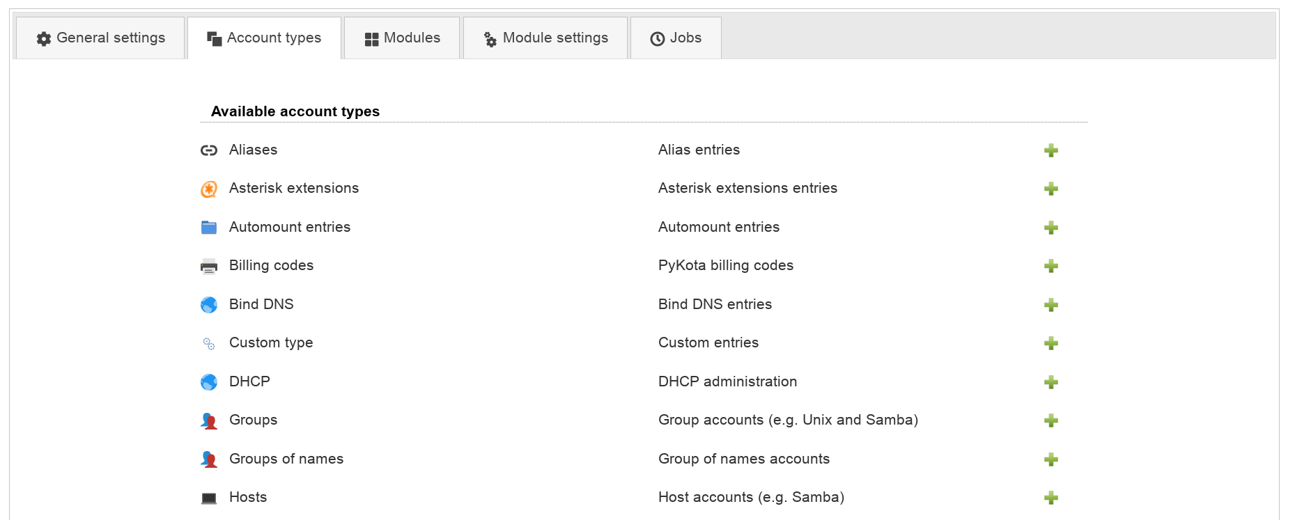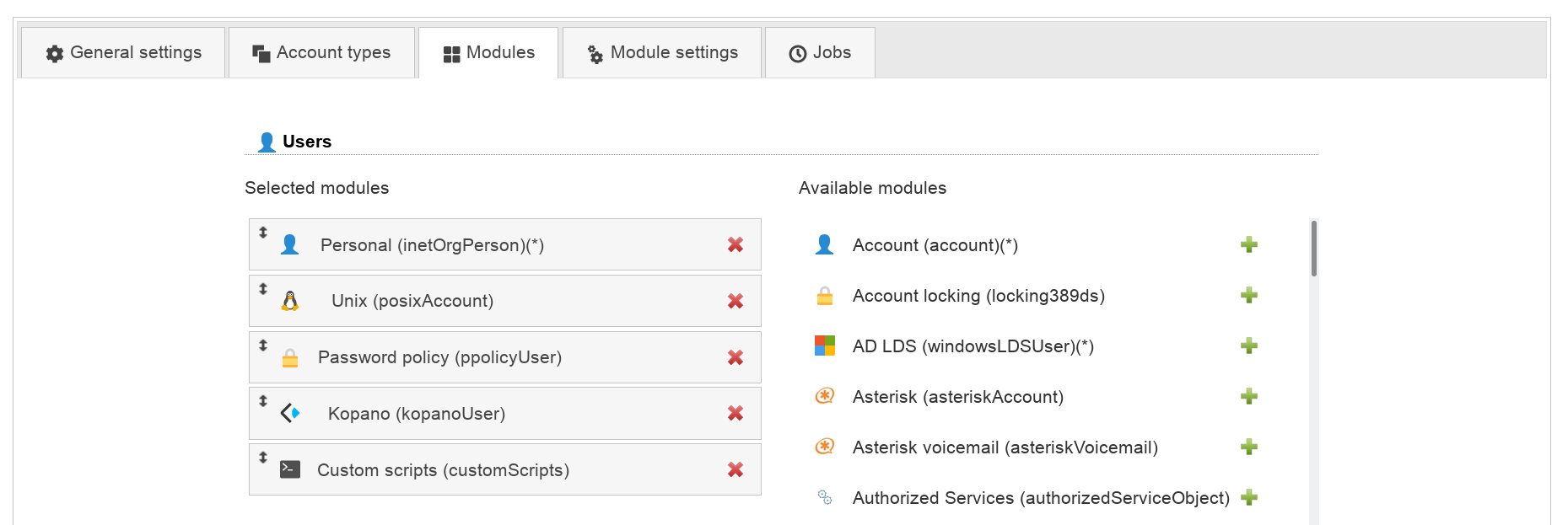 The modules specify the active extensions for each account type. E.g. here you can setup if your user entries should be address book entries only or also support Unix or Samba.