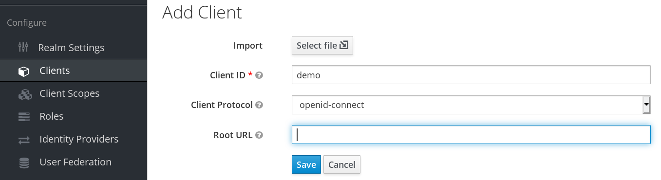 Create a new client, select "openid-connect" protocol and enter a client ID. Root URL can be left empty.