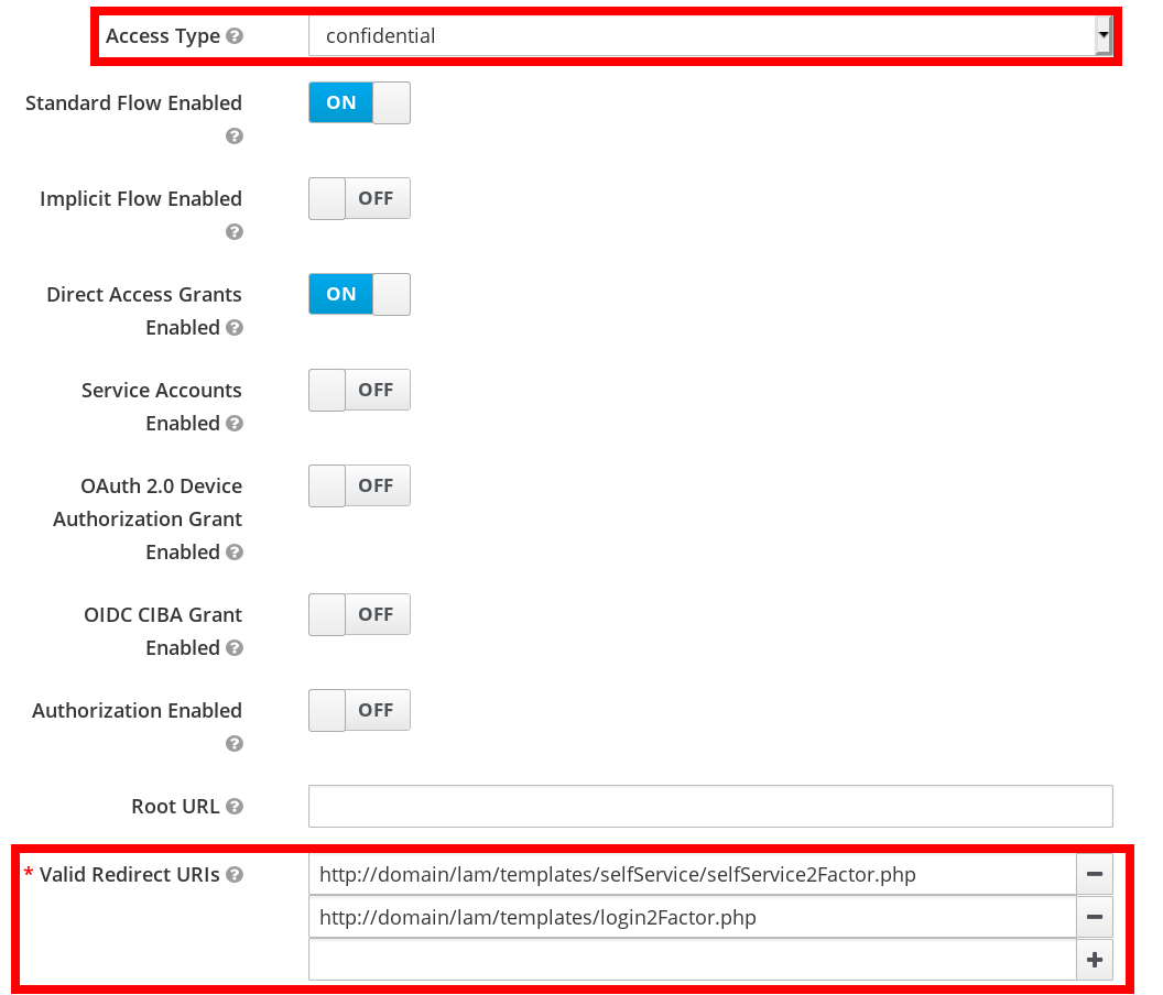 Now choose access type "confidential" and enter the valid redirect URLs. They are "https://YOURDOMAIN/lam/templates/login2Factor.php" for admin interface and "https://YOURDOMAIN/lam/templates/selfService/selfService2Factor.php" for self service. You will get an error message during login in case it was wrong. Then save the configuration.