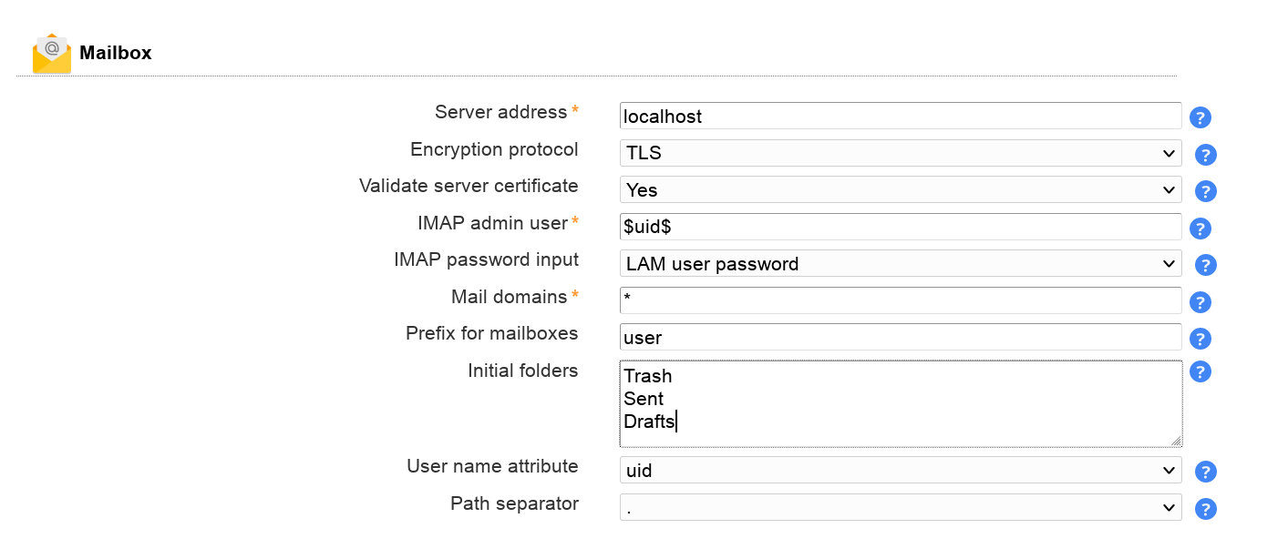 The mail domains specify for which accounts mailboxes may be created/deleted. E.g. if you enter "lam-demo.org" then mailboxes can be managed for "user@lam-demo.org" but not for "user@example.com". Use "*" for any domain.