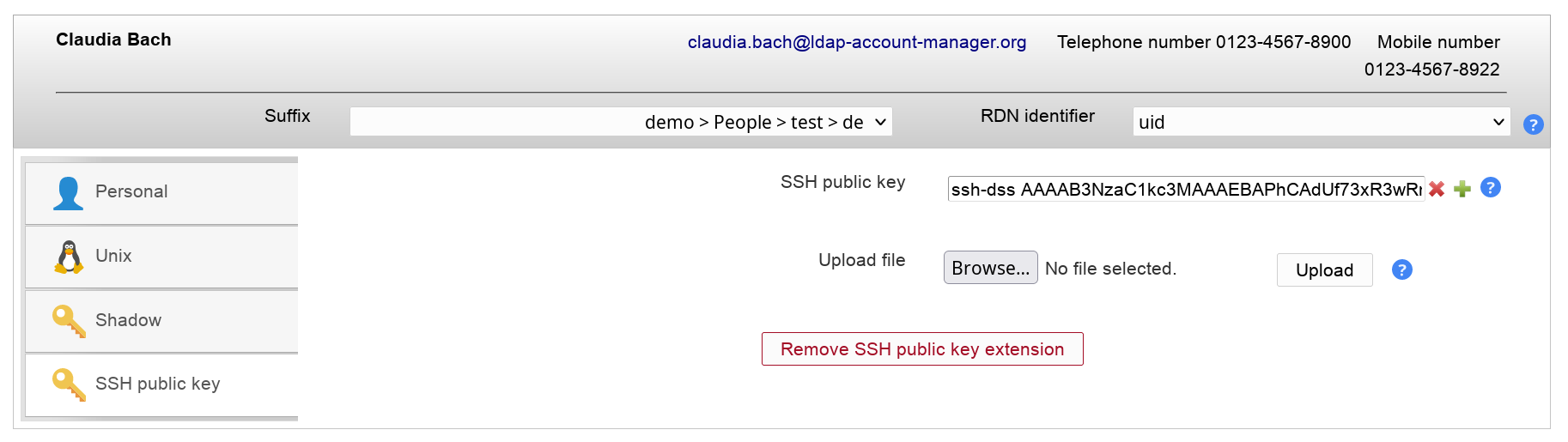 You can manage your public keys for SSH in LAM if you installed the LPK patch for SSH or setup AuthorizedKeysCommand (see below).