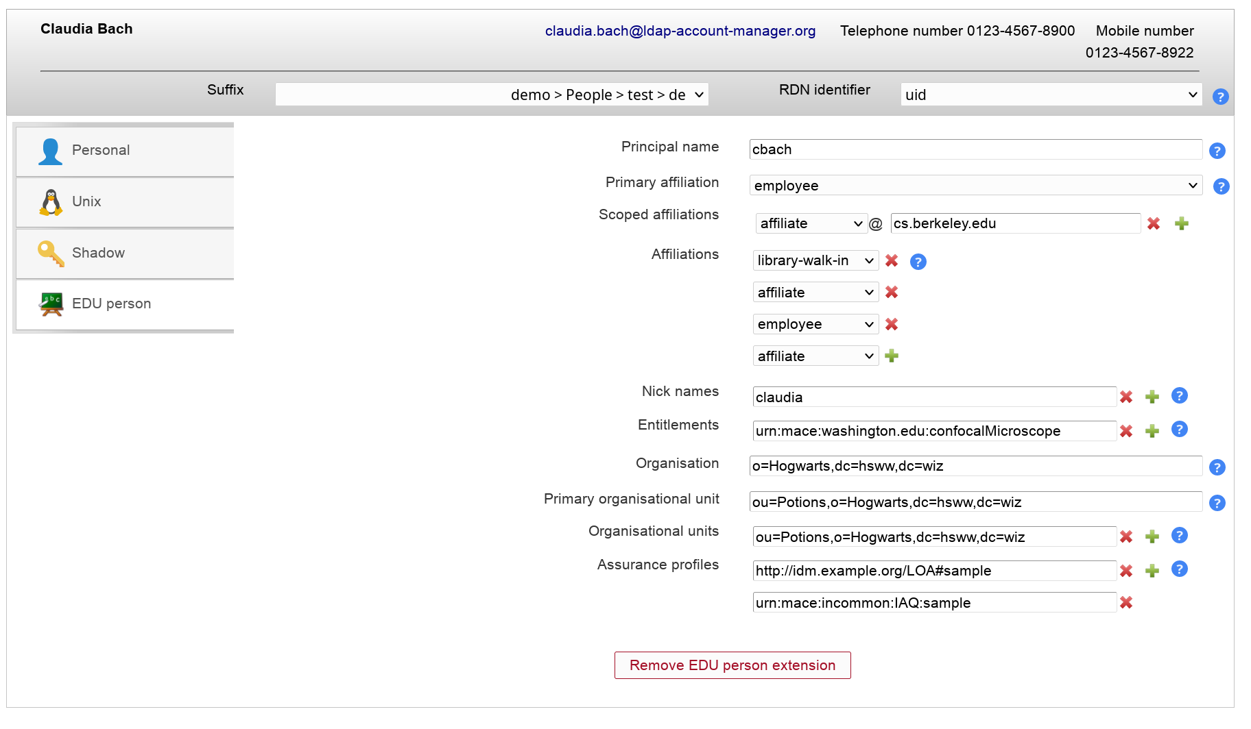 LAM manages various types of user accounts. This includes address book entries, Unix, Samba, Kopano and much more.