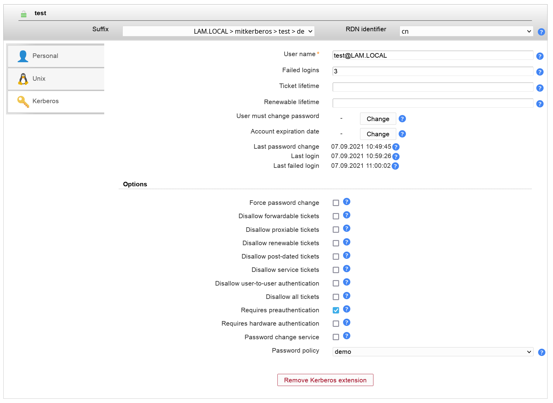 You can manage your MIT Kerberos accounts with LAM Pro. Please add the user module "Kerberos (mitKerberos)" to activate this feature. If you want to manage entries based on the structural object class "krbPrincipal" please use "Kerberos (mitKerberosStructural)" instead.