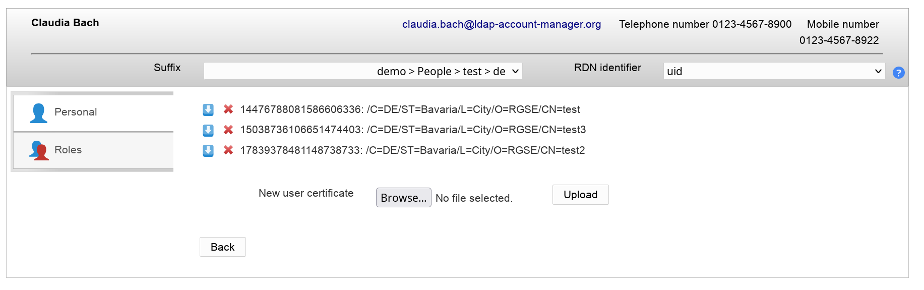 User certificates can be uploaded and downloaded. LAM will automatically convert PEM to DER format.