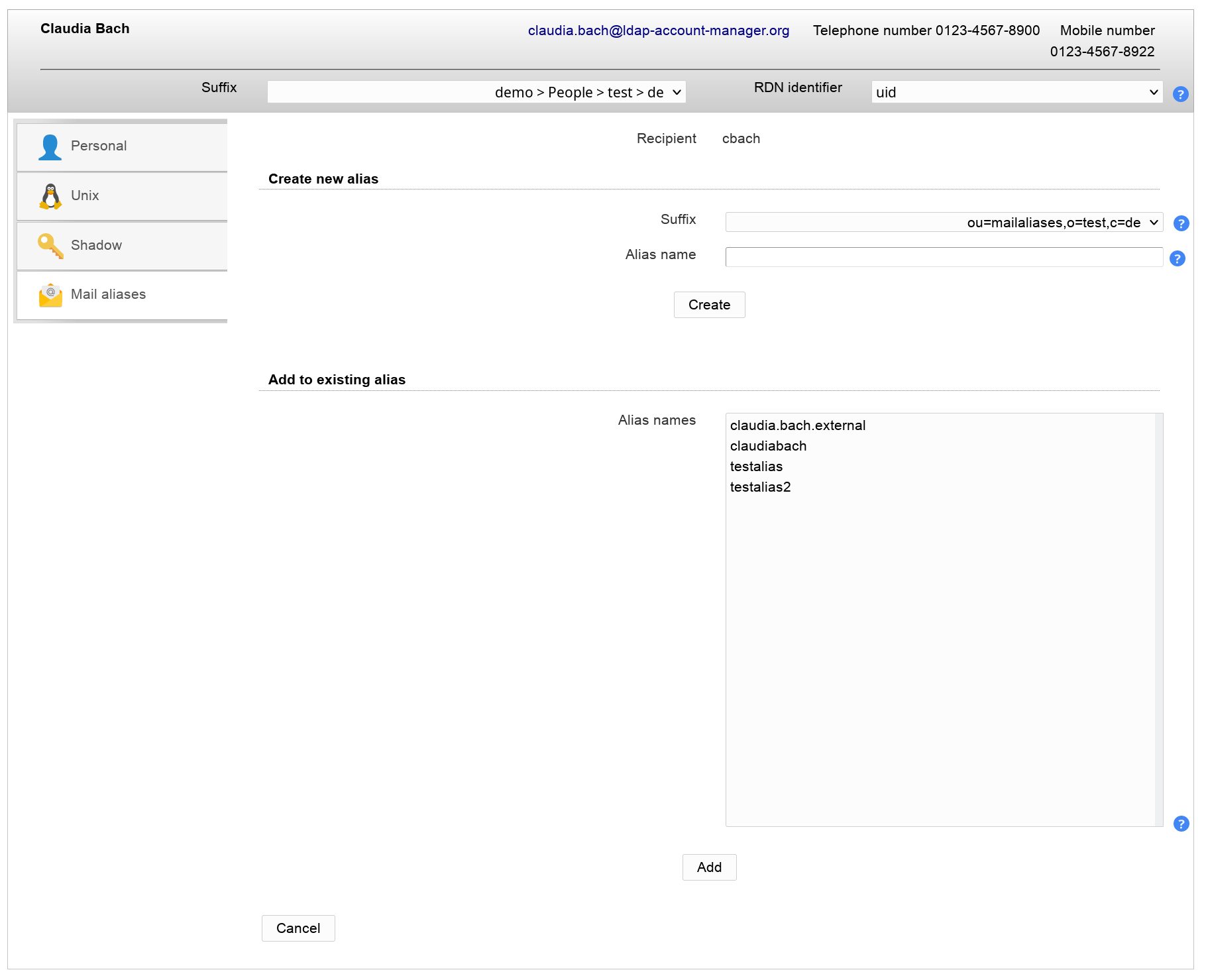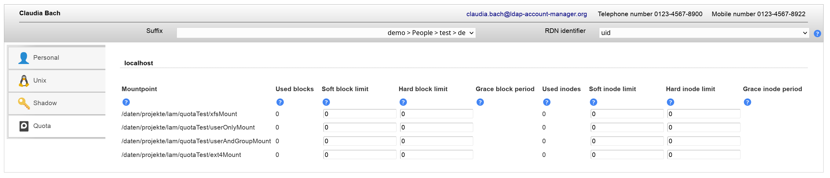 LAM Pro manages all qmail attributes for users. This includes mail addresses, ID numbers and quota settings.