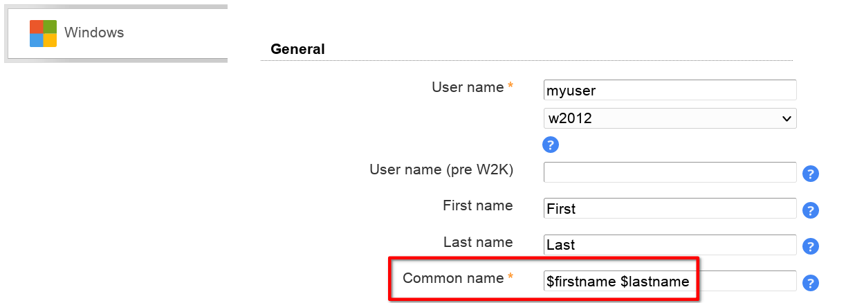 Use this when some of your data always follows the same schema. E.g. using "$firstname $lastname" in common name field can be used like this to get "First Last". You can set the wildcards in profile editor so they are automatically applied for new users.