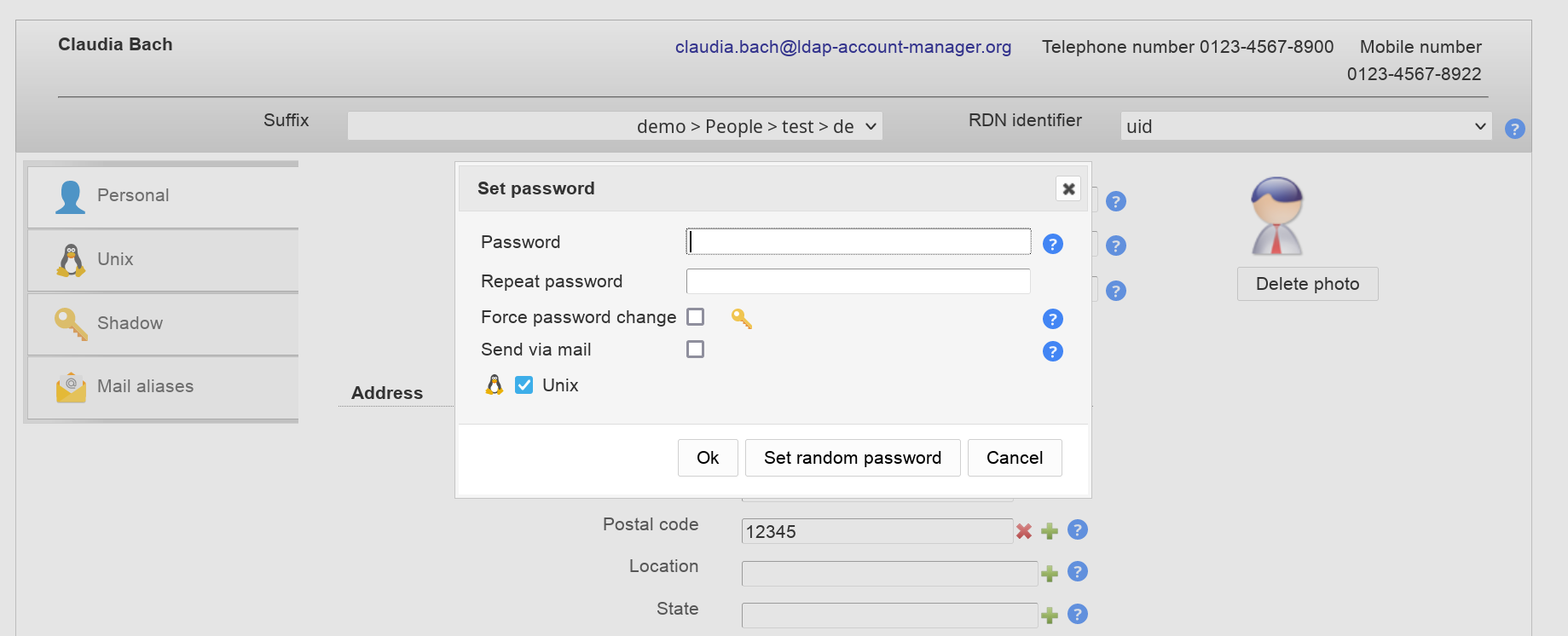 Click the "Set password" button to change the user's password(s). Depending on the active account modules LAM will offer to change multiple passwords at the same time.