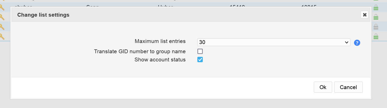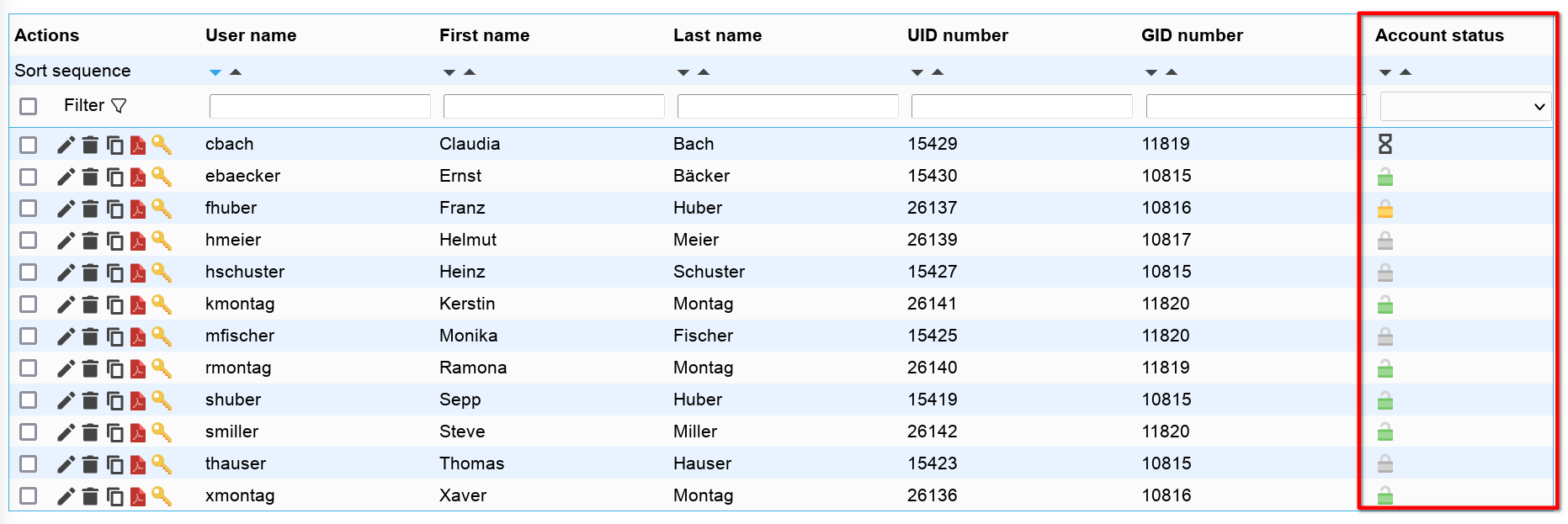 Show account status: If you activate this option then there will be an additional column displayed that shows if the account is locked or expired. You can see more details when moving the mouse cursor over the lock icon. This function supports Unix, Samba, PPolicy, Windows and 389ds locking+deactivation.
